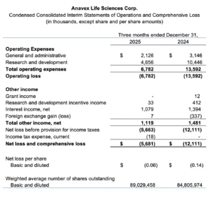 NEW YORK – February 9, 2026 – Anavex Life Sciences Corp. (“Anavex” or the “Company”) (Nasdaq: AVXL), a clinical-stage biopharmaceutical company focused on developing innovative treatments for Alzheimer’s disease, Parkinson’s disease, schizophrenia, neurodevelopmental, neurodegenerative, and rare diseases, including Rett syndrome, and other central nervous system (CNS) disorders, today reported financial results for its first quarter of fiscal 2026.