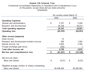 Anavex Life Sciences Corp. (“Anavex” or the “Company”) (Nasdaq: AVXL), a clinical-stage biopharmaceutical company focused on developing innovative treatments for Alzheimer’s disease, Parkinson’s disease, schizophrenia, neurodevelopmental, neurodegenerative, and rare diseases, including Rett syndrome, and other central nervous system (CNS) disorders, today reported financial results for its second quarter of fiscal 2025.